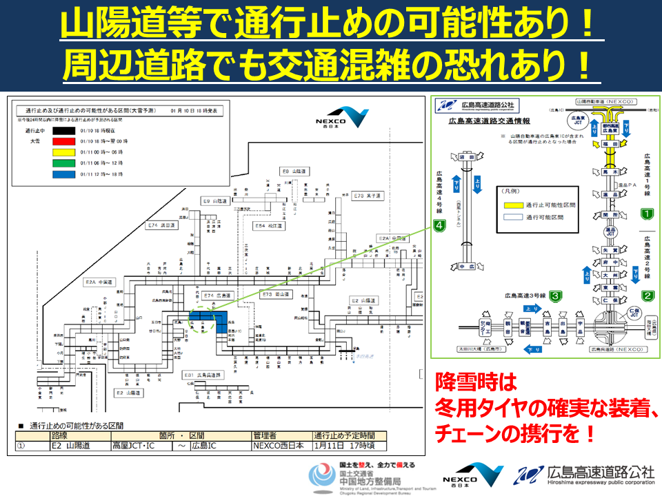 HOME 新着情報 新着情報 新着情報・過去の主なトピックス 2026/01/20 呉駅交通ターミナル整備「工事の進捗状況」更新しました 2026/01/10 山陽道等で通行止めの可能性あり!周辺道路でも交通混雑の恐れあり! 2026/01/10 大雪の影響による通行止めの可能性のある区間のお知らせ 2025/11/17 呉駅交通ターミナル整備「工事の進捗状況」更新しました 2025/10/16 呉駅交通ターミナル整備「工事の進捗状況」更新しました 2025/09/25 一般国道2号西広島バイパス都心部延伸事業の工事着手日のお知らせ 2025/09/11 一般国道2号西広島バイパス都心部延伸に関する工事説明会での意見・質問と回答を掲載しました 2025/09/10 令和7年度国土交通省中国地方整備局選考採用試験(社会人経験者・係長級(技術))のご案内 2025/09/06 一般国道2号西広島バイパス都心部延伸に関する工事説明会資料を掲載しました 2025/08/29 呉駅交通ターミナル整備「工事の進捗状況」更新しました 2025/08/21 令和7年度第1回広島県道路交通渋滞対策部会の会議資料を掲載しました 2025/06/25 広島南道路トップに【R7.6.24~R7.6.28設計説明会(木材港西~廿日市)】資料を掲載しました 2025/05/23 一般国道2号西広島バイパス都心部延伸に関する工事説明会での意見・質問と回答を掲載しました 2025/05/19 令和7年度就業体験実習インターンシップ(技術系)の受付を開始しました! 2025/05/13 西広島バイパスのサイトを更新しました 2025/04/24 令和7年度国土交通省中国地方整備局選考採用試験(社会人経験者・係長級(技術))のご案内 2025/03/28 令和6年度第2回広島県道路交通渋滞対策部会の議事概要を掲載しました 2025/03/24 令和6年度第2回広島県道路交通渋滞対策部会の会議資料を掲載しました 2025/03/19 呉駅交通ターミナル整備のサイトをを更新しました 2025/03/17 事故ゼロプラン(広島県)を更新しました 2025/03/03 令和7年度路上工事抑制カレンダーを掲載しました(令和7年2月27日時点) 2025/02/28 安芸津バイパスのサイトを更新しました 2025/02/26 岩国・大竹道路のサイトを更新しました 2025/02/13 令和6年度中国地区「官庁Watching」事前予約のご案内 2025/02/06 令和7年度「道路ふれあい月間」推進標語を募集しています 2025/02/04 令和7年度道路災害応急対策活動等に関する基本協定 募集要項を掲載しました 2024/12/19 呉駅交通ターミナル整備イメージ図(動画)を掲載しました 2024/12/18 西広島バイパスのサイトを更新しました 2024/11/05 【中国地方整備局】令和6年度(第4回)選考採用試験(社会人経験者・係長級(技術)の募集を行っています 2024/10/08 サイジョウインフォメーションを更新しました 2024/10/04 令和6年度 技術系(高卒・社会人(係員級))「個別業務説明会」のご案内 2024/10/04 令和6年度 技術系(高卒・社会人(係員級))「官庁訪問(面接)」のご案内 2024/10/01 【建設】令和6年度(第3回)選考採用試験(社会人経験者・係長級(技術))の募集を行っています 2024/08/29 維持管理計画を更新しました 2024/07/26 【中国地方整備局】2024年度「国家公務員OPENゼミ第2弾!~1Day職場訪問・仕事体験~」 2024/07/04 道路ライブカメラのメンテナンスが終了しました 2024/06/21 サイジョウインフォメーションを更新しました 2024/06/17 【中国地整】選考採用試験(社会人経験者・係長級(技術)~6月17日(月)から募集開始します~ 2024/06/05 サイジョウインフォメーションを更新しました 2024/05/31 道路台帳を掲載しました 2024/05/15 中国地方整備局のインターンシップを募集しております!! 2024/04/03 サイジョウインフォメーションを更新しました 2024/03/15 広島県道路交通渋滞対策アドバイザー会議の検討結果を掲載しました 2024/03/05 国道2号コネクトパーキング宮島整備事業計画検討会(第2回)の資料を掲載しました 2024/03/01 サイジョウインフォメーションを更新しました 2024/02/20 【西広島バイパス高架延伸工事】特設サイトを開設しました 2024/02/16 令和6年度「道路ふれあい月間」推進標語を募集しています 2024/02/09 令和6年度路上工事抑制カレンダーを掲載しました(令和6年2月9日時点) 2024/02/08 サイジョウインフォメーションを更新しました 2024/02/06 ≪規制内容の変更≫西条バイパス道照交差点夜間交通規制のお知らせ ~橋梁架設に伴う交通規制~ 2024/02/05 令和6年度道路災害応急活動に関する基本協定の締結希望者を募集します 2024/01/29 東広島バイパス(中野東IC~海田東IC間)夜間通行止め規制日変更のお知らせ 2023/11/27 ≪規制期間の変更≫【E75】東広島・呉自動車道 黒瀬IC~高屋JCT・IC間 平日夜間全面通行止めのお知らせ 2023/10/30 道の駅「西条のん太の酒蔵」顔認証システム導入による全国初の24時間無人コンビニオープンのお知らせ~道の駅では全国初の施設一体型 24 時間無人コンビニ~ 2023/10/07 【西広島バイパス都心部延伸 設計説明会(10/7(土)大手町平和ビル会場)】の資料を掲載しました 2023/10/06 【西広島バイパス都心部延伸 設計説明会(10/6(金)広島市役所会場)】の資料を掲載しました 2023/10/05 【西広島バイパス都心部延伸 設計説明会(10/5(木)観音公民館会場)】の資料を掲載しました 2023/10/04 【西広島バイパス都心部延伸