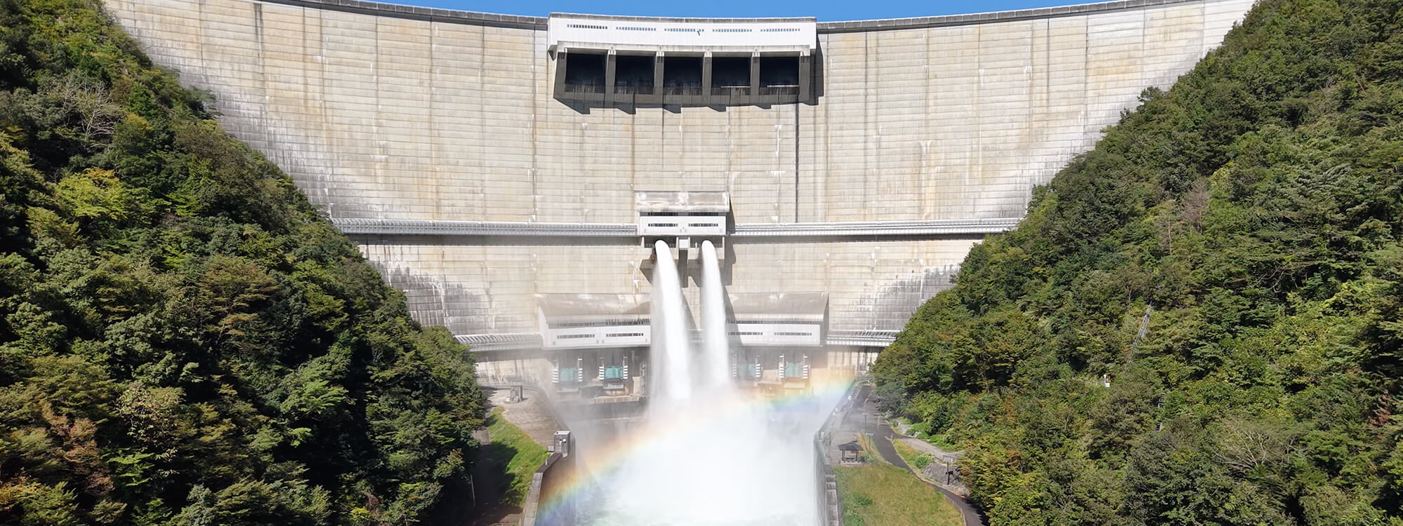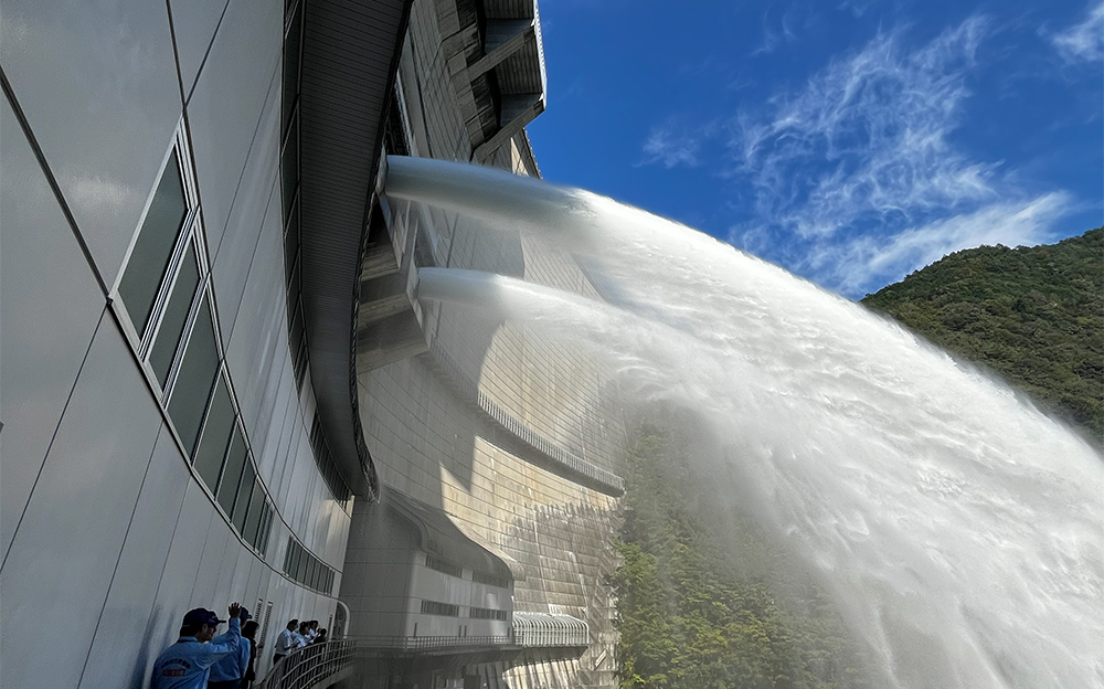 温井ダムの見どころといえば、落差60メートルで放たれる放流です。毎年4月から11月頃まで実施している中位標高放流設備からの放流は、2つの放流口から水が放出されます。水しぶきをあげながら、美しい放物線を描く大迫力の放流は必見です。