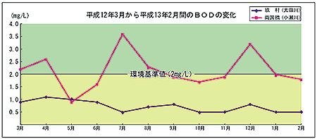 小瀬川の両国橋地点では1.8mg/Lで、先月に比べ数値は減少していて、環境基準値(2mg/L)以下できれいな水と言えます。