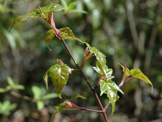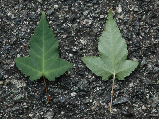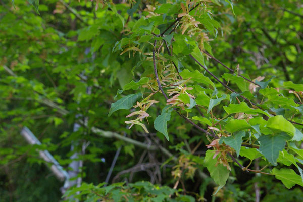 落葉樹林やアカマツ林 によく生育しています。広島西部山系の中では、よく見る植物の代表選手です。葉は、いわゆるモミジの葉とは異なり、切れ込みは浅く、時に切れ込みがなかったりします。名前が似ている樹木にウリハダカエデがありますが、葉の形、大きさが全然違います。 高さ5~8mほどになる雌雄異株(しゆういしゅ)の落葉小高木です。葉は対生し、卵形をしています。