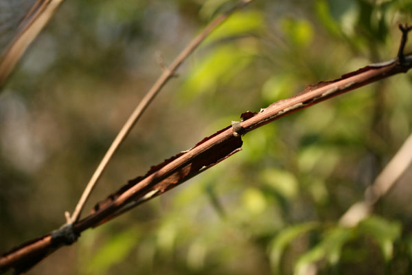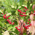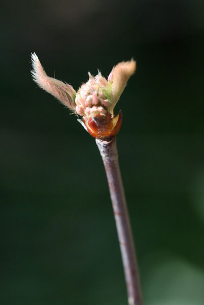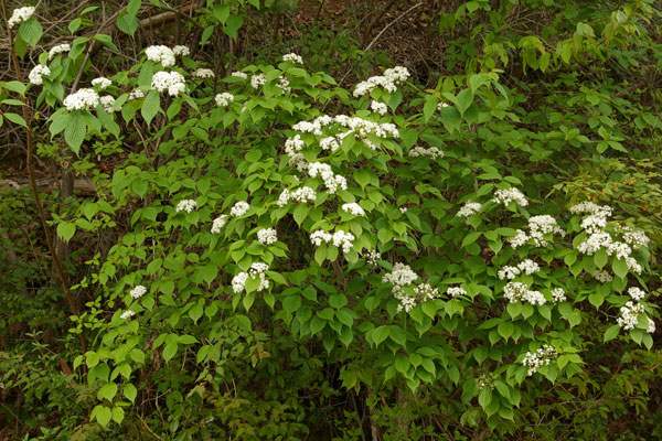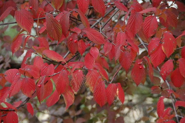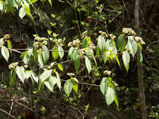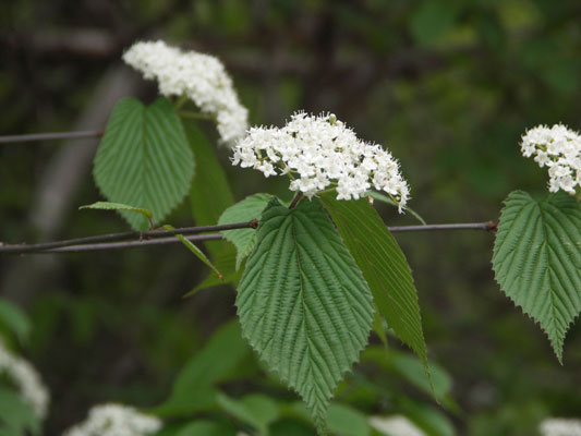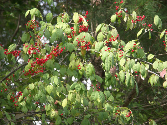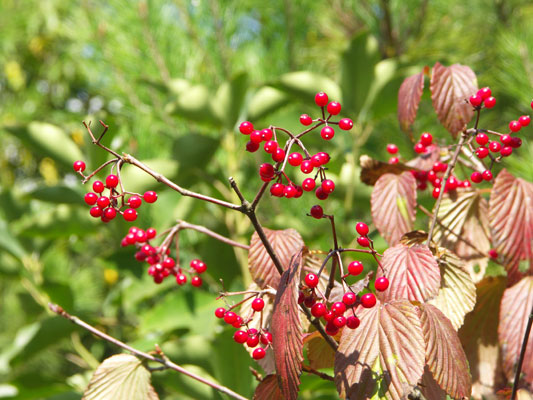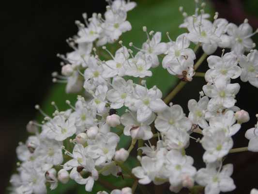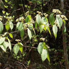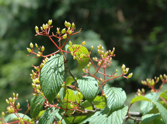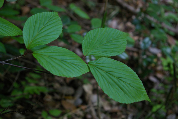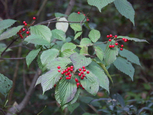 「深山(みやま)」と名前が付いているわりには、人里近いアカマツ林やコナラ林 でもよく見られます。秋に赤い実がなります。味は甘酸っぱく、果実酒にすると酸味が効いた、薄紅色のお酒ができます。 高さ4mに達する落葉低木です。葉は対生し、葉の形は卵形です。先は急にとがり三角形の鋸歯(きょし)を持っています。