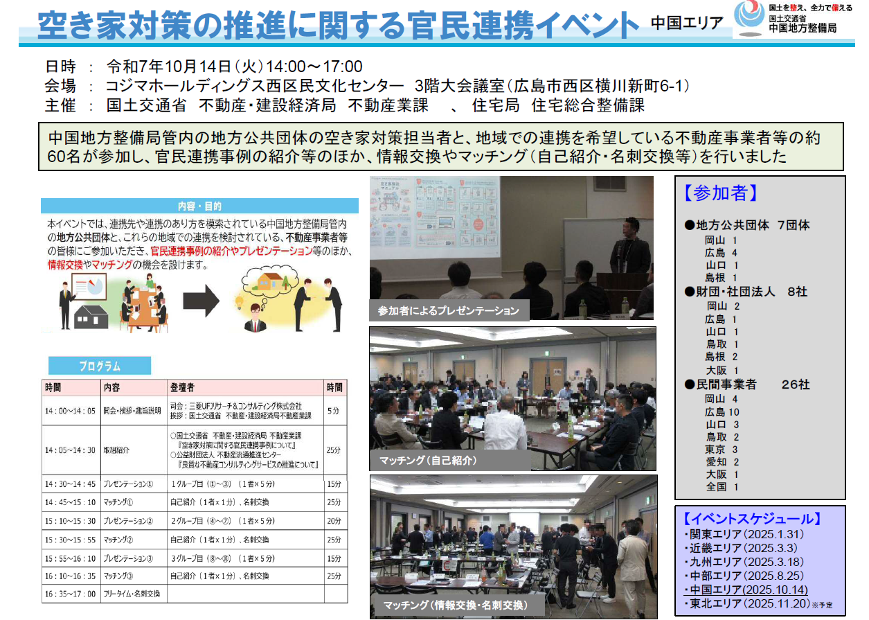 本イベントでは、連携の重要性や必要性は理解するものの、知り合う機会がない、どのように連携すればよいのか分からないといった声も寄せられている中で、このような状況を踏まえ、不動産事業者等と地方公共団体の皆様にご参加いただき、官民連携事例の紹介、情報交換やマッチングの機会を設けるため開催しているものであり、本年(2025年)1月より各地域で開催しているところです。