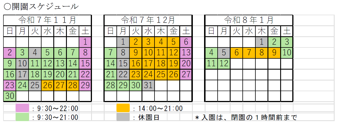 11月及び12月 ⇒ 17:30~21:001月 ⇒ 17:45~21:00