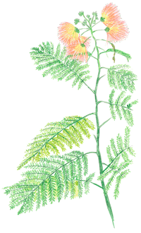 6月末ピンクの花がつぎつぎ咲き、後さやに豆ができます。軸に小さい葉が18対以上向かい合ってついたものが、さらに7対以上中心の軸についた1枚の葉です。夜、小さい葉を上に閉じ、葉全体は垂れ下がって眠ります。