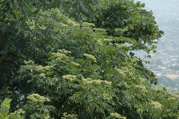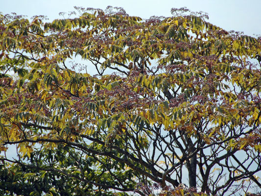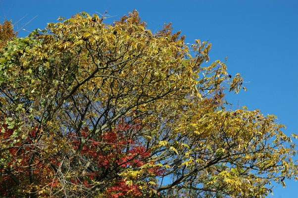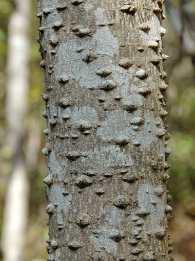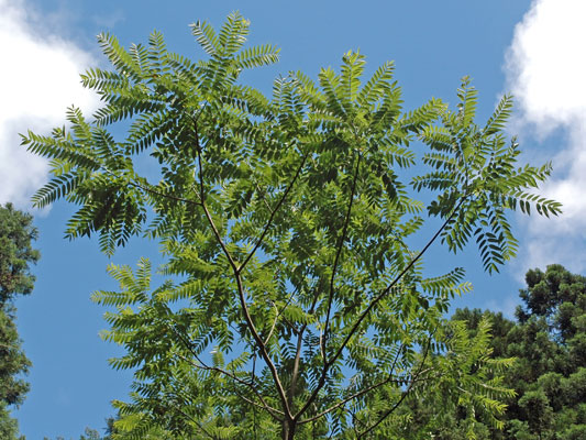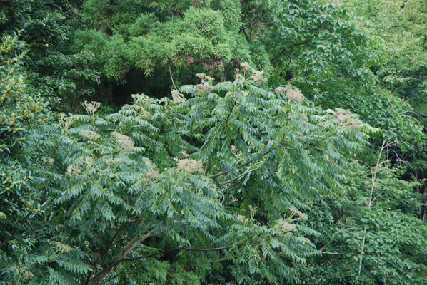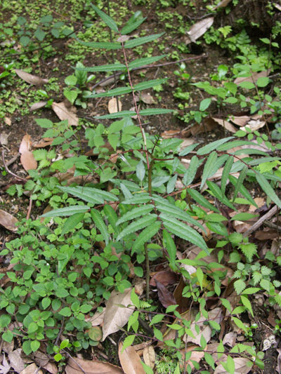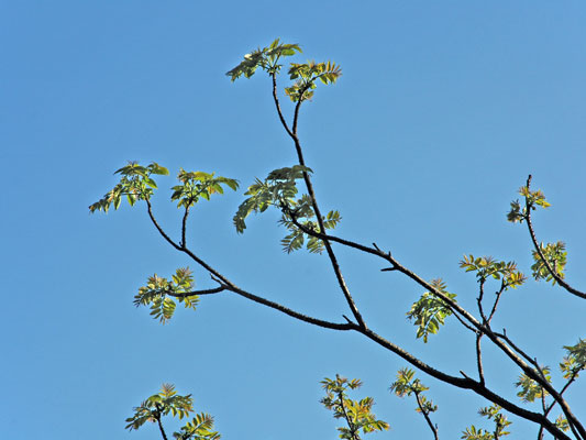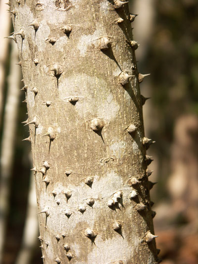 明るい場所の低木林 で見られる代表的な樹木です。見るからに痛そうなトゲトゲの樹皮と、ちぎったときの独特のにおいが特徴です。 高さ7~15mになる落葉高木です。茎にはトゲが並んでいます。葉は、10~20枚程度の小さな葉が鳥の羽根のようにならんだ羽状複葉(うじょうふくよう)とよばれる形です。